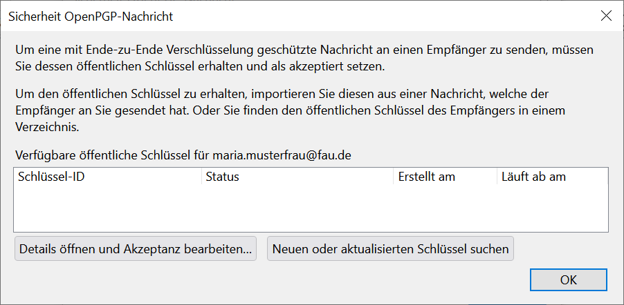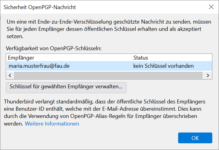 Wenn Sie nun auf Senden klicken, erscheint zunächst ein Fenster mit einer Fehlermeldung, wenn für die adressierte Empfängerin in der Thunderbird-Schlüsselverwaltung noch kein Schlüssel vorhanden ist. Wenn Sie dieses wegklicken, sehen Sie folgendes Fenster: