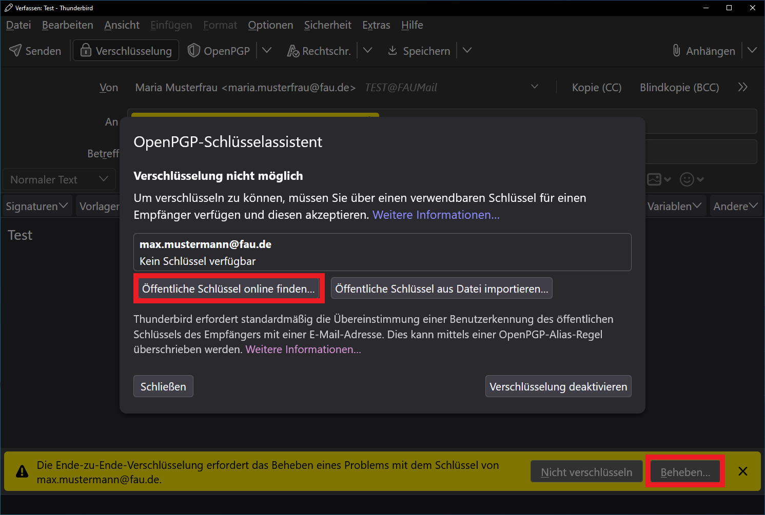 Wenn in der Thunderbird-Schlüsselverwaltung kein Schlüssel für den Empfänger gefunden wird, dann wird dies durch eine gelbe Unterlegung des Adressfeldes und ein Warnsymbol gekennzeichnet. Gleichzeitig erscheint unten eine entsprechende Statuszeile. Klicken Sie hier auf die Schaltfläche Beheben. Es öffnet sich der OpenPGP-Schlüsselassistent und bietet u.a. die Option Öffentliche Schlüssel online finden an. Wenn Sie diese Schaltfläche anklicken, wird im Web Key Directory (WKD) nach einem Schlüssel gesucht.