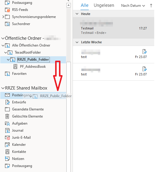 Oben genannte Ordner/Objekte können Sie auch ebenfalls entweder per „Drag & Drop“ oder über das Kontextmenü „Ordner verschieben“ in die Shared-Mailbox verschieben.