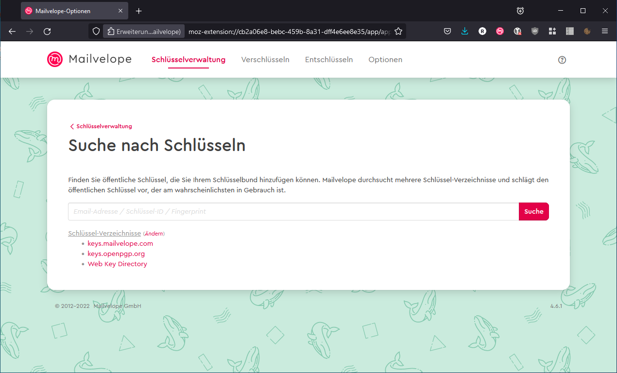 Mailvelope hat in der Version 4.6.1 einen Bug, aufgrund dessen trotz korrekter Signatur „Signatur unbekannt … Schlüssel … nicht gefunden“ angezeigt wird, wenn unter Optionen >> Allgemein als Backend OpenPGP.js verwendet wird. Dieses Problem sollte in der Nachfolgeversion behoben sein.