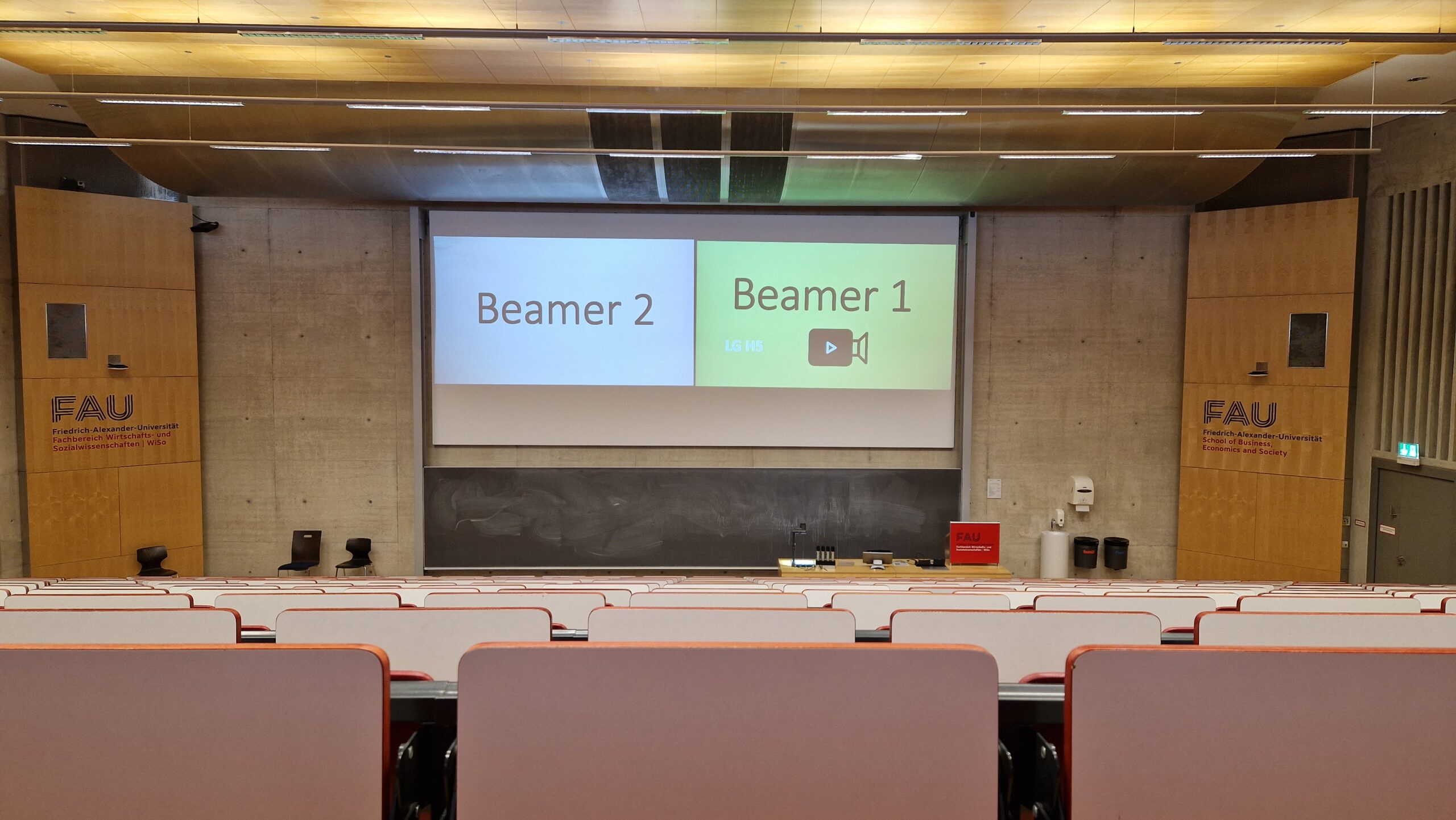 Die Technik im Raum ermöglicht ebenfalls die Durchführung von hybriden Lehrveranstaltungen und Videokonferenzen. Beachten Sie, dass hierfür ein eigenes Notebook erforderlich ist.
