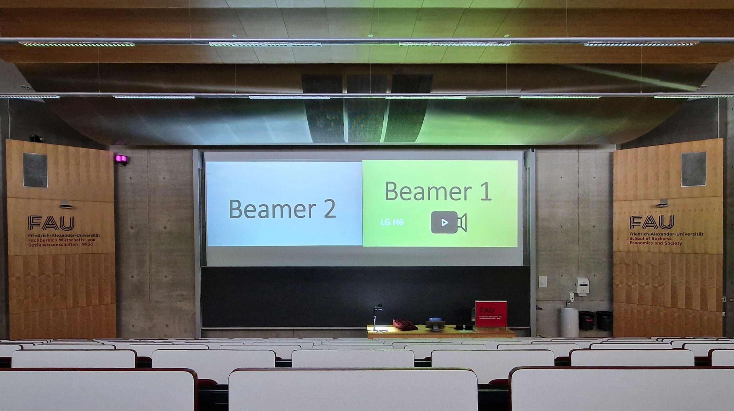 Die eingebaute Technik ermöglicht Aufzeichnungen und Livestreams über das Videoportal FAU.tv. Die Aufzeichnungen können sowohl geplant als auch automatisiert gestartet und beendet werden. Um eine Aufnahme zu ermöglichen, muss das Preset „Hybridvorlesung EIN“ am Touchpanel ausgewählt sein, damit die Kamera aktiviert wird.