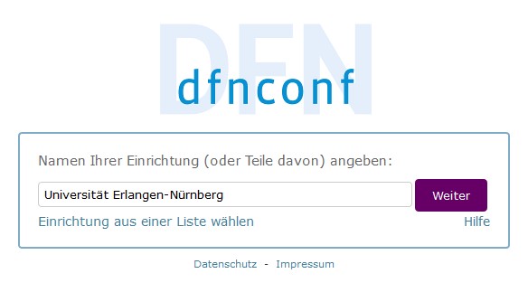 Um Besprechungen über Video- und Telefonkonferenzen durchzuführen, können Sie den Dienst DFNconf nutzen. Jeder Mitarbeiter der FAU kann diesen Dienst kostenlos nutzen und eigene Video- und Konferenzräume einrichten. Um diesen Dienst zu nutzen, gehen Sie wie folgt vor: