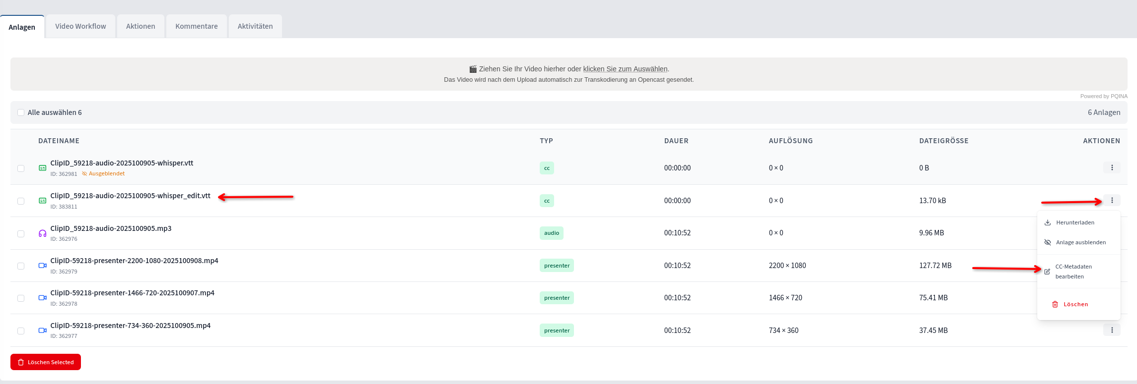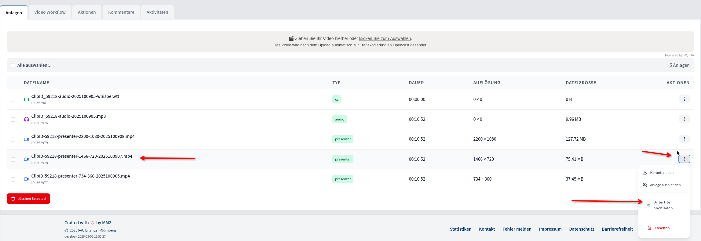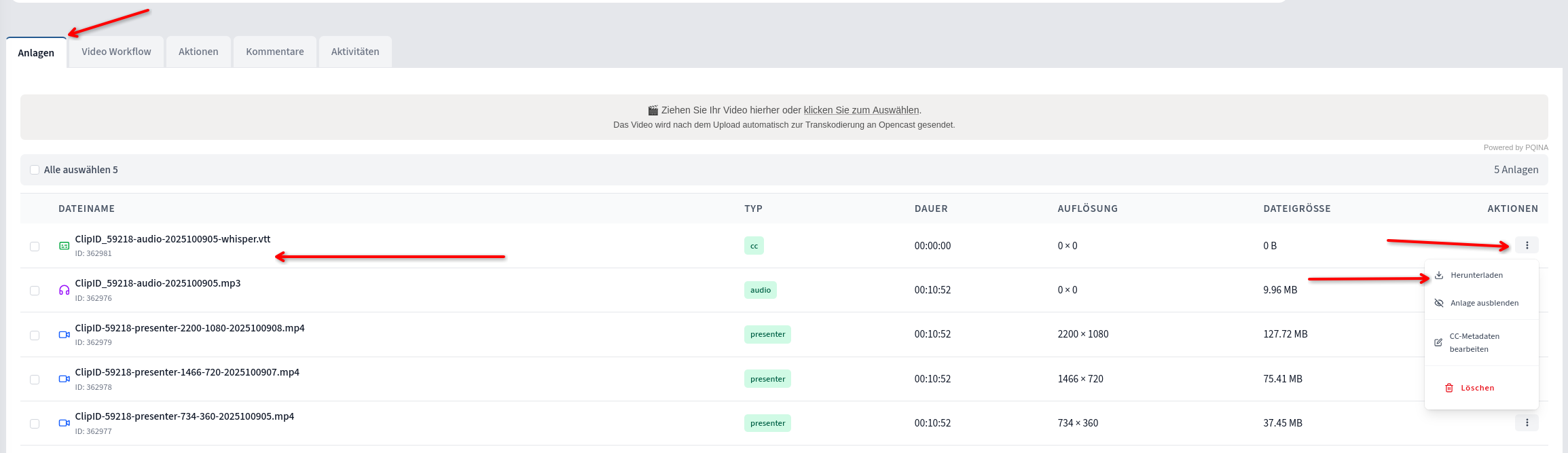 Das Videoportal generiert standardmäßig automatisch eine Untertitel-Datei pro Clip. Sie haben jedoch die Möglichkeit, diese Datei herunterzuladen, zu korrigieren und anschließend wieder hochzuladen.