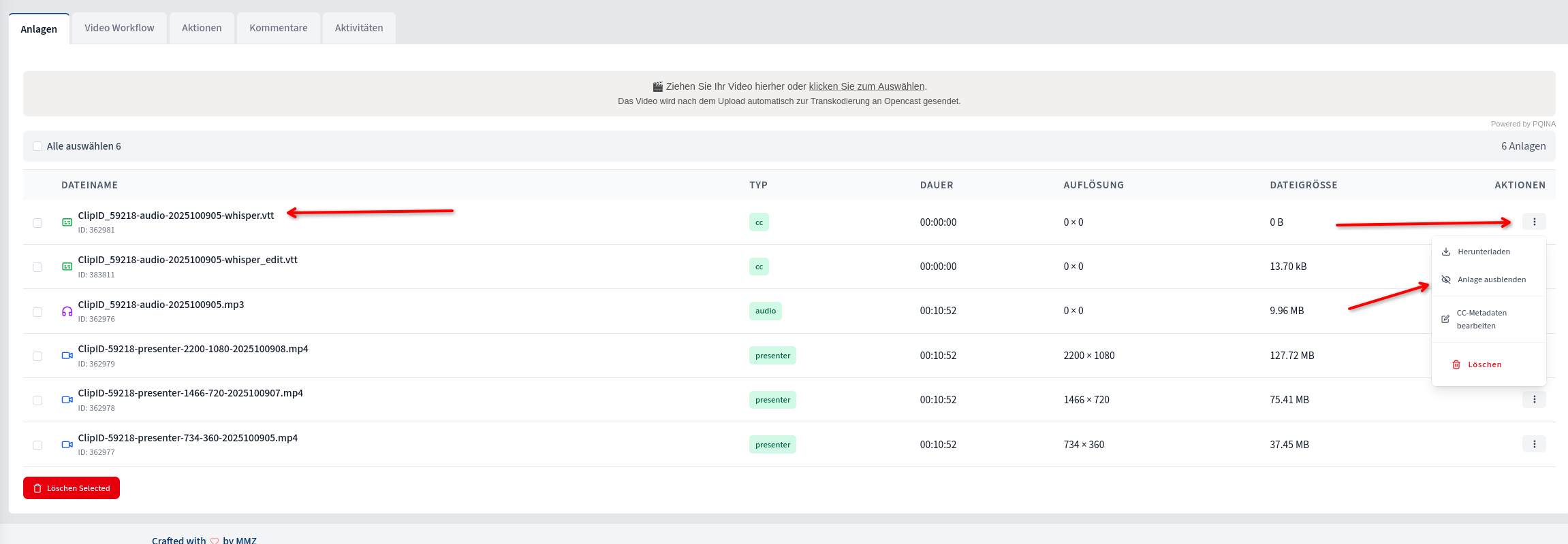 Damit der Player die neue Datei verwendet, müssen Sie zunächst die automatisch generierte Untertitel-Datei des Videoportals ausblenden.