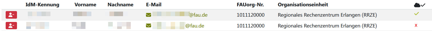 Wenn die Cloud-Nutzungsbestimmungen noch nicht akzeptiert sind, wird dies durch ein rotes X (11) rechts neben der E-Mail-Adresse angezeigt. Für jeden Hersteller muss die Zustimmung zur Datenübertragung an Cloud-Dienste einzeln erteilt werden, zum Beispiel für Microsoft oder für Adobe. Die Zustimmung erfolgt über den IdM SELF SERVICE. Erst danach werden das Benutzerkonto angelegt und das Abo zugewiesen.