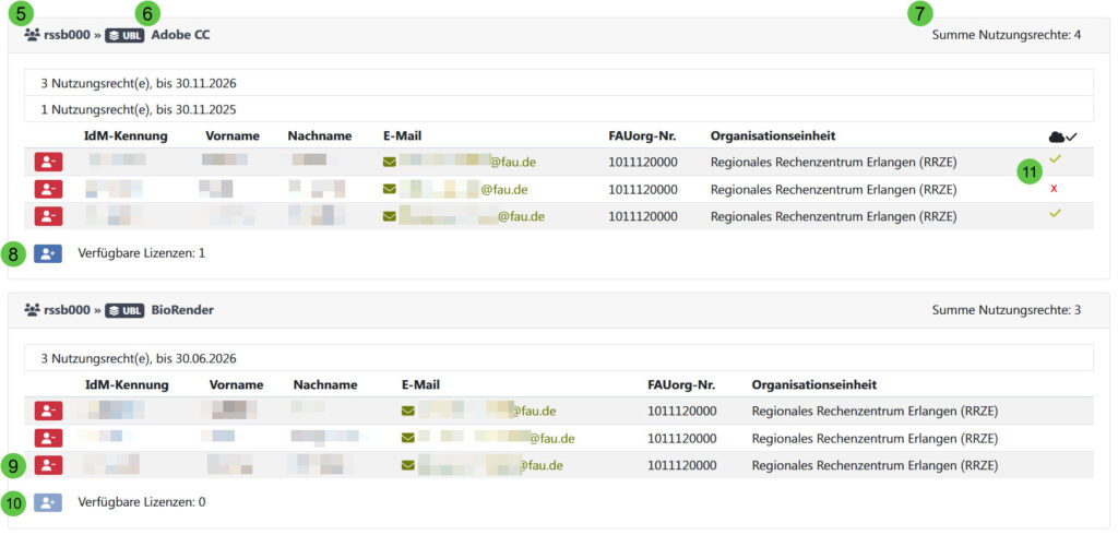 Auf das rote Personensymbol (9) mit dem Minuszeichen klicken, um eine Lizenz zu entziehen.