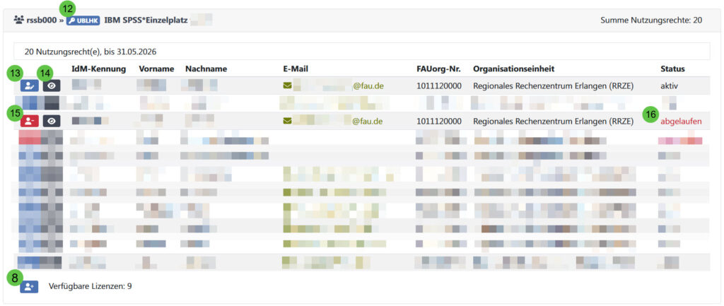 UBLHK-Zuweisungen können nur am Ende der jeweiligen Lizenzlaufzeit (16) über das rote Personensymbol (15) entfernt werden.