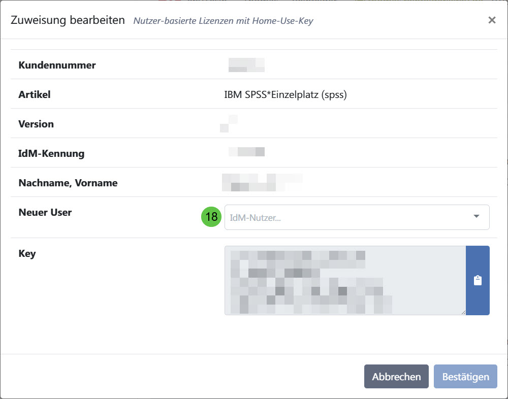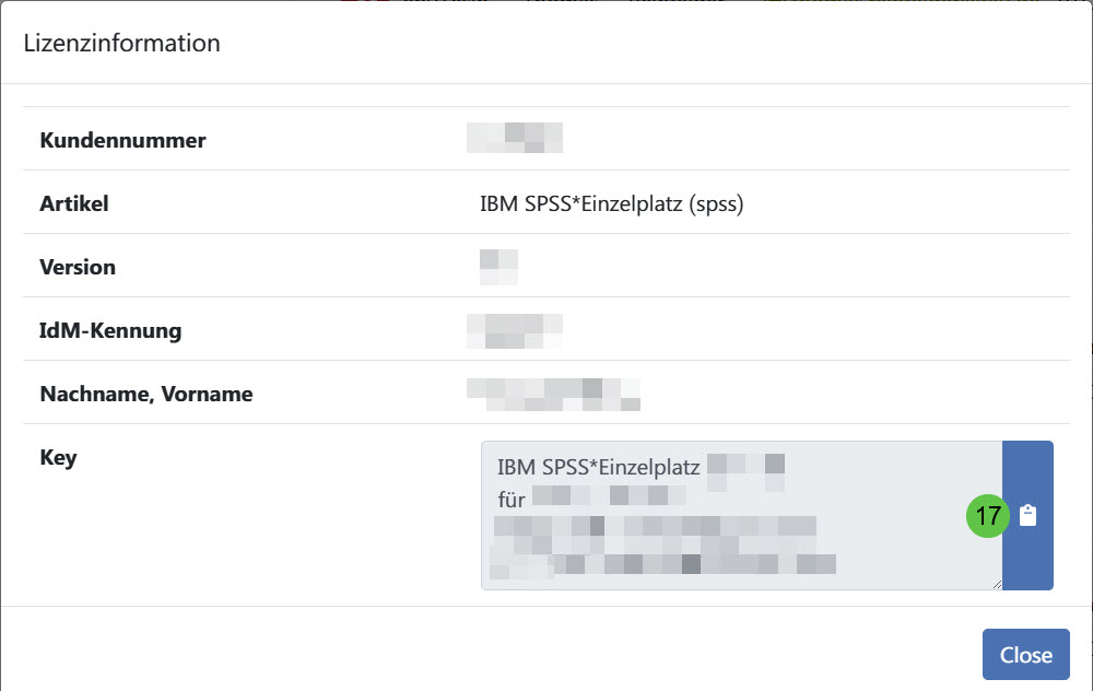 Nach Zuweisung kann die Lizenzinformation über das schwarze Augensymbol (14) angezeigt werden. Durch Klicken auf das blaue Klemmbrettsymbol (17) wird die Lizenzinformation in die Zwischenablage kopiert.